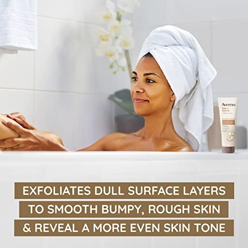 - 8-ounce tube of Aveeno Tone + Texture Renewing Body Scrub gently exfoliates dull surface layers to smooth bumpy, rough skin and reveal a more even skin tone in just one week