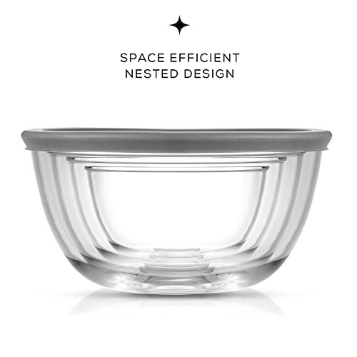 - Durable Bowls That Nest With Ease: When it comes to glass mixing bowls you want them sturdy thick clear and space saving right? If so you’ll probably love these four thick strong mixing bowls with lids They neatly nest for easy compact storage and tough enough for life! Cook for Joy by JoyJolt.